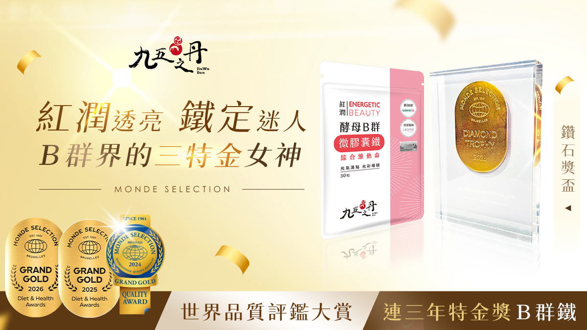 2026年,九五之丹「紅潤.酵母B群+微膠囊鐵」憑藉連三年奪下特金獎的卓越表現,正式摘下這座鑽石桂冠。這座獎盃不僅是榮耀,更代表我們對原料選擇、製程控管的堅持,始終如一。