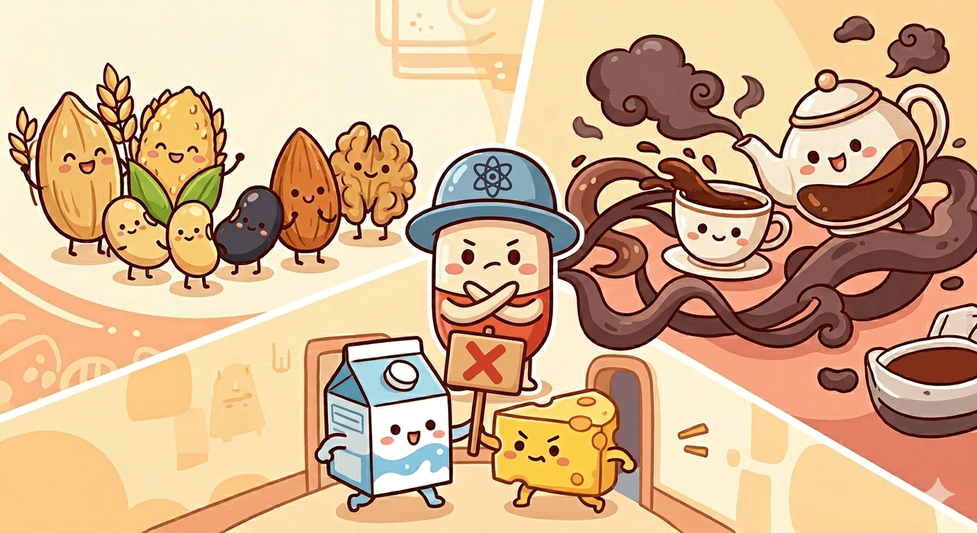 從上述來看,鐵劑保健品搭配維生素 C 能有效促進吸收。但相反的,鐵劑保健品和什麼一起補充,會妨礙吸收呢?為了確保最佳補鐵效益,務必在補鐵時避開以下 4 大禁忌: