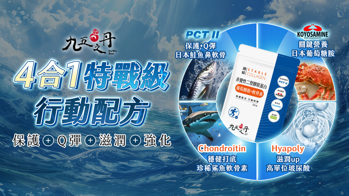 像是我們九五之丹【鐵騎.PCTII+葡萄糖胺+軟骨素】就堅持採用升級版 PCT2 成分,讓追求高效保養的族群,能更精準獲得高階養護效果,讓靈活行動力更不受限!