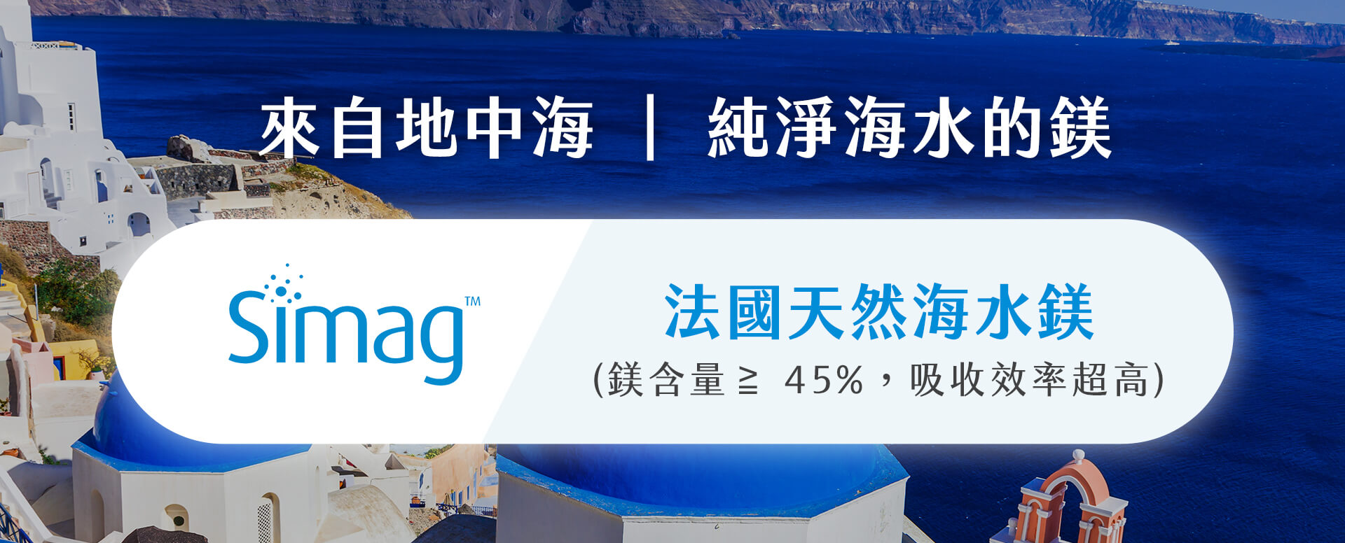 海水鎂是指從海水中提取的微量元素,是一種重要的礦物質。鎂對人體健康有許多方面的影響,包括對心臟、肌肉及神經的正常功能的支持,以及骨骼健康的維護。鈣和鎂在體內有著相互作用,添加適當的鎂有助於提高鈣的吸收率,使鈣更有效地進入體內。Simag™是來自法國的頂尖礦物質萃取專家,取自地中海純淨海水,以溫和且無溶劑的獨家製程萃取出海水鎂,非化學合成、無輻射與過敏原,安全可靠。