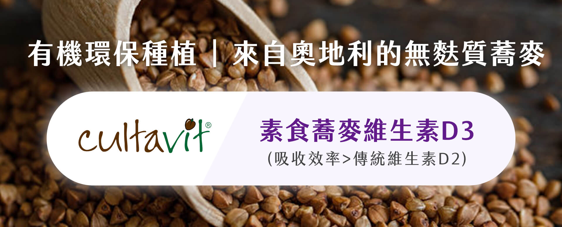 來自奧地利的cultavit®維生素D3是以獨家技術萃取自蕎麥,與一般的維生素D3來源大多為動物性來源大相逕庭,100%來自蕎麥的維生素D3不含麩質,無添加任何化學成分,不會造成腸胃負擔且好吸收,更具有較高的生物利用率,且素食者亦可食用。