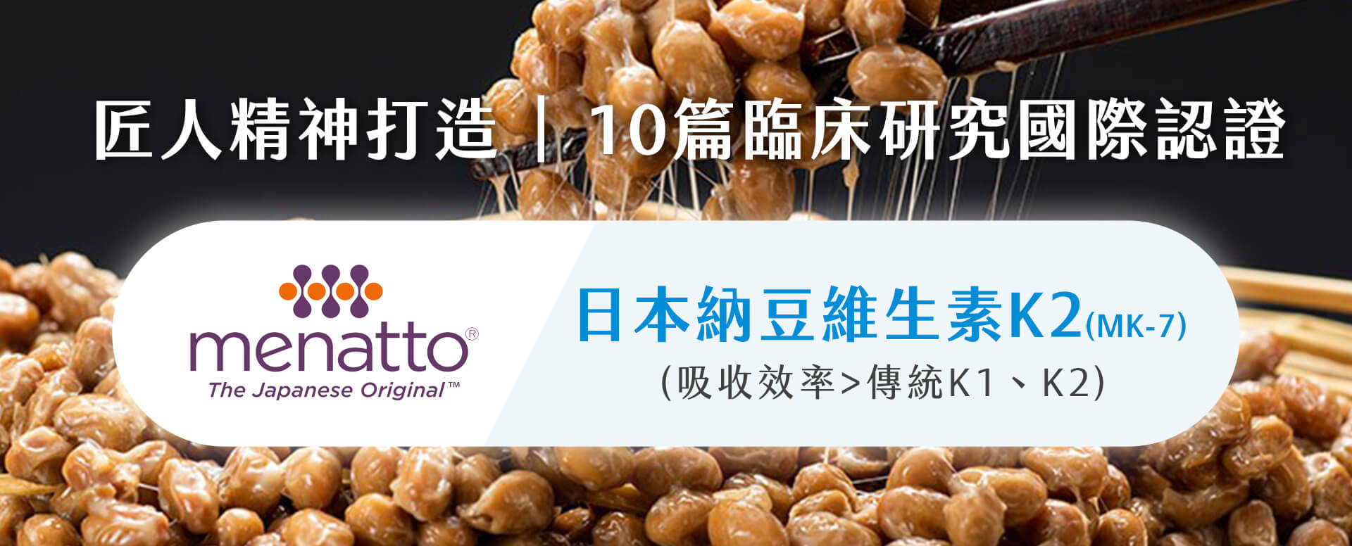 納豆中的維生素K2(MK-7型)有助於提高鈣的吸收效率。menatto™是來自日本的專利發酵工藝大廠,擁專利發酵製程且全生產階段皆可追溯,品質穩定有保障。以日本非基改納豆為原料,從原料製造到出貨都受到嚴格的控管,並具有生物利用度等臨床試驗支持。