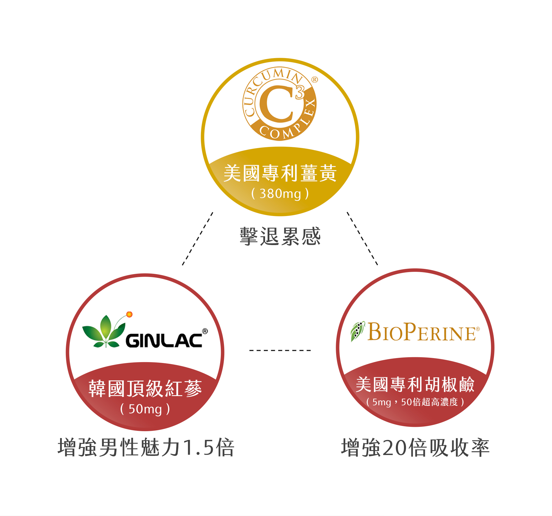 | 成份(每粒) | C3 Complex®薑黃萃取、Ginlac ®專利韓國紅蔘萃取、BioPerine®胡椒鹼 |