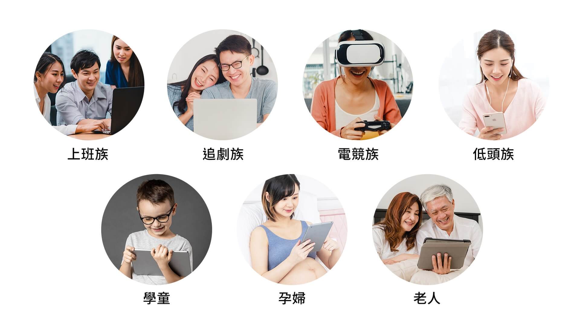 | 適用族群 | 上班族、追劇族、電競族、3C低頭族、學童、孕婦、老人 |