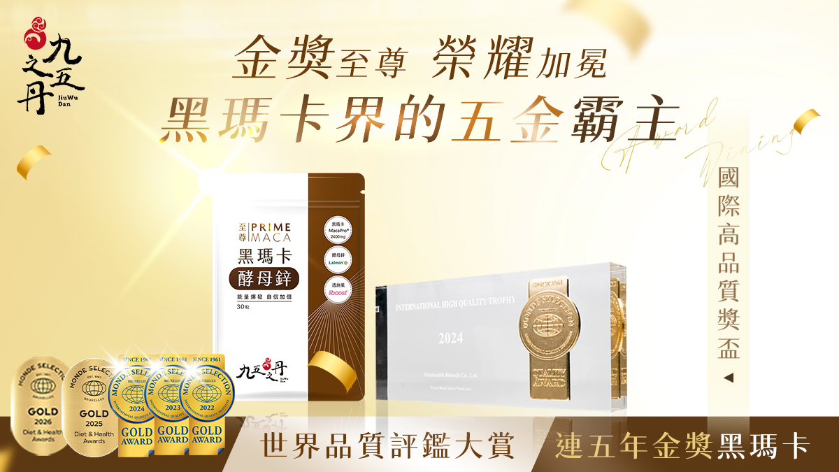 在世界品質評鑑大會上,除了每年針對優秀產品頒發特金獎、金獎、銀獎和銅獎外,對於連續四年獲得特金獎或金獎的優質產品,還會頒發更高等級的特殊獎盃-國際高品質獎盃,是該品項的最高榮譽象徵。「至尊.黑瑪卡+酵母鋅」在2024年奧地利維也納舉辦的世界品質評鑑中榮獲此殊榮,也使九五之丹成為台灣第一個在黑瑪卡品項上獲得此特殊獎盃的品牌。