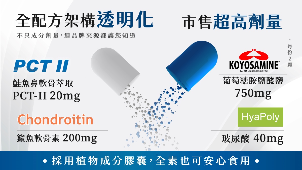 每份2粒,含PCTII鮭魚鼻軟骨萃取(非變性二型膠原蛋白)20mg、美國鯊魚軟骨素200mg、Koyosamine®葡萄糖胺鹽酸鹽750mg、玻尿酸40mg